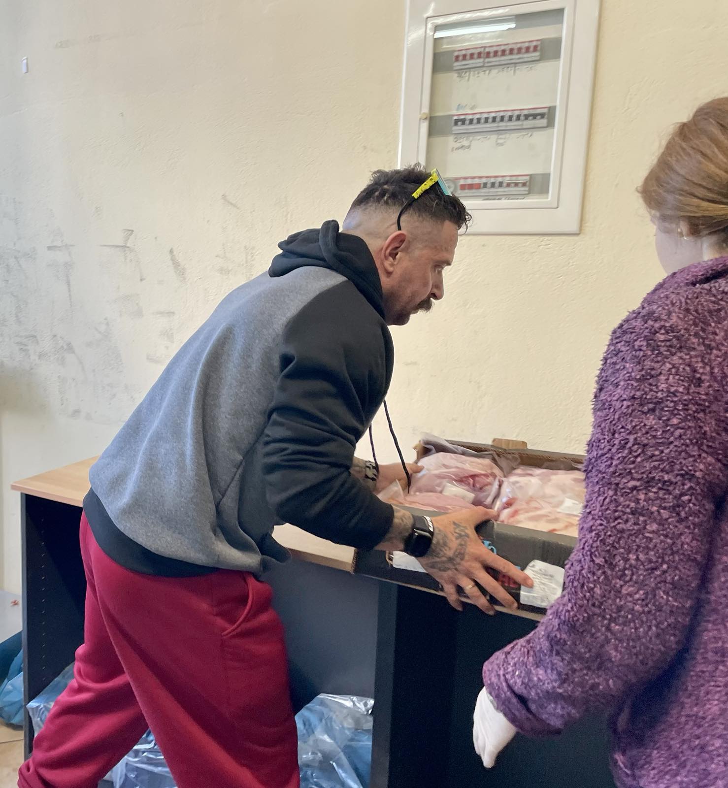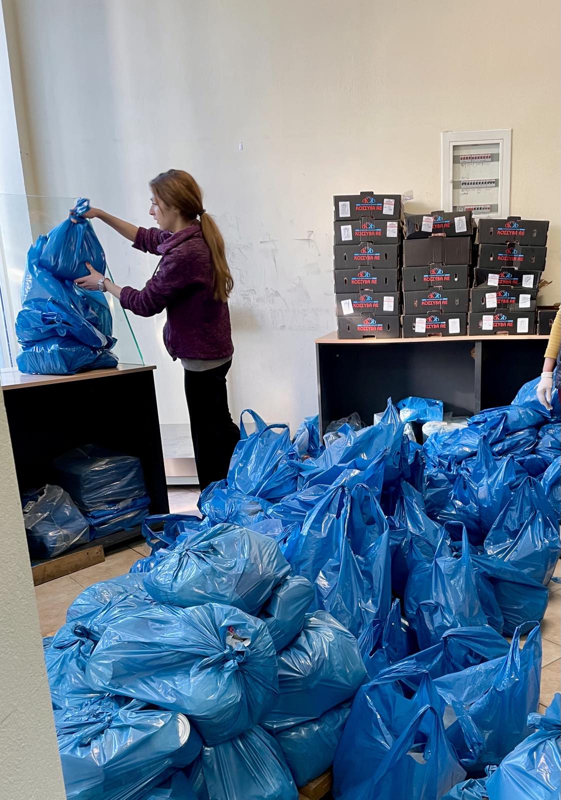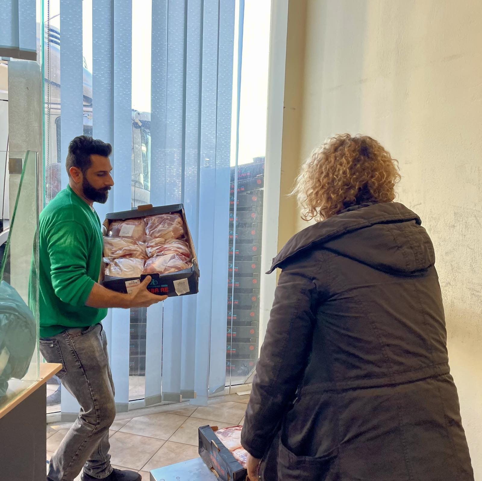 Στη διαδικασία της διανομής συνέβαλαν και μαθητές του Εσπερινού Λυκείου Αγρινίου, προσφέροντας εθελοντικά βοήθεια στη μεταφορά των κιβωτίων χοιρινού κρέατος.