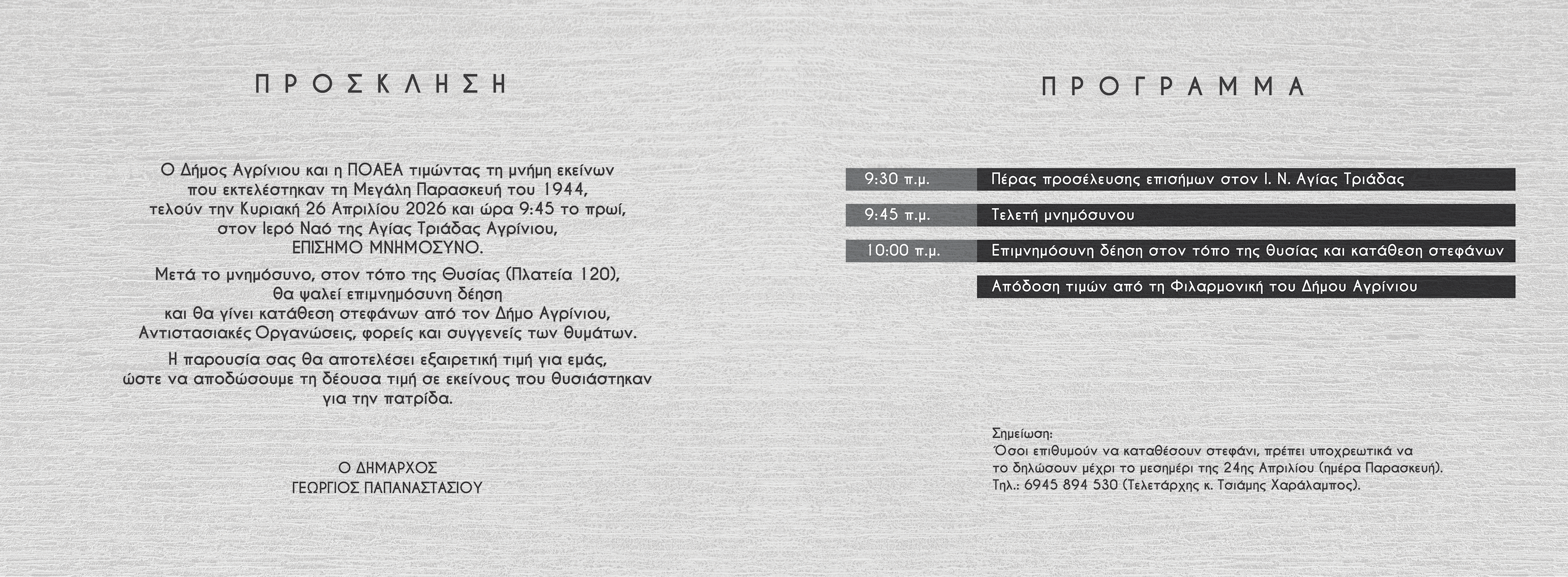 Ο Δήμος Αγρινίου, σε συνεργασία με την ΠΟΑΕΑ, τιμώντας τη μνήμη των εκτελεσθέντων της Μεγάλης Παρασκευής 1944, διοργανώνει την Κυριακή 26 Απριλίου 2026 και ώρα 09:45 π.μ. Επίσημο Μνημόσυνο στον Ιερό Ναό Αγίας Τριάδας.