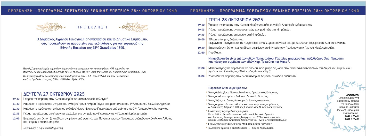 ΠΡΟΣΚΛΗΣΗ-ΠΡΟΓΡΑΜΜΑ ΕΟΡΤΑΣΜΟΥ ΕΘΝΙΚΗΣ ΕΠΕΤΕΙΟΥ 28ης ΟΚΤΩΒΡΙΟΥ 1940