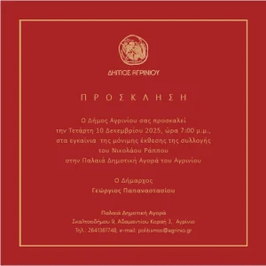 Σε μια βραδιά που αναμένεται να σηματοδοτήσει ένα νέο κεφάλαιο για την πολιτιστική ζωή της πόλης, ο Δήμος Αγρινίου εγκαινιάζει τη Μόνιμη Έκθεση της Συλλογής Νικολάου Ράππου.
