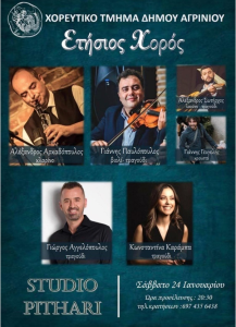 Το 2026 ήρθε και ο μεγάλος ετήσιος χορός του Χορευτικού Τμήματος του Δήμου Αγρινίου είναι γεγονός. Το Σάββατο 24 Ιανουαρίου 2026, στις 20:30 στο κέντρο Studio Pithari σας περιμένουμε όλους σε ένα παραδοσιακό αλλά και λαϊκό γλέντι με εξαιρετικούς μουσικούς.