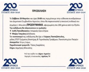 Η ποιητική συλλογή «Προσκύνημα» του συγγραφέα Δημήτρη Μανιάτη, αφιερωμένη στα 200 χρόνια από την Έξοδο του Μεσολογγίου, παρουσιάζεται στο Αγρίνιο, στο πλαίσιο των επετειακών εκδηλώσεων για τη μεγάλη αυτή ιστορική στιγμή του Ελληνισμού, το Σάββατο 28 Μαρτίου 2026, στις 19:00 στην αίθουσα του Δημοτικού Συμβουλίου, Κτίριο τράπεζας της Ελλάδος.